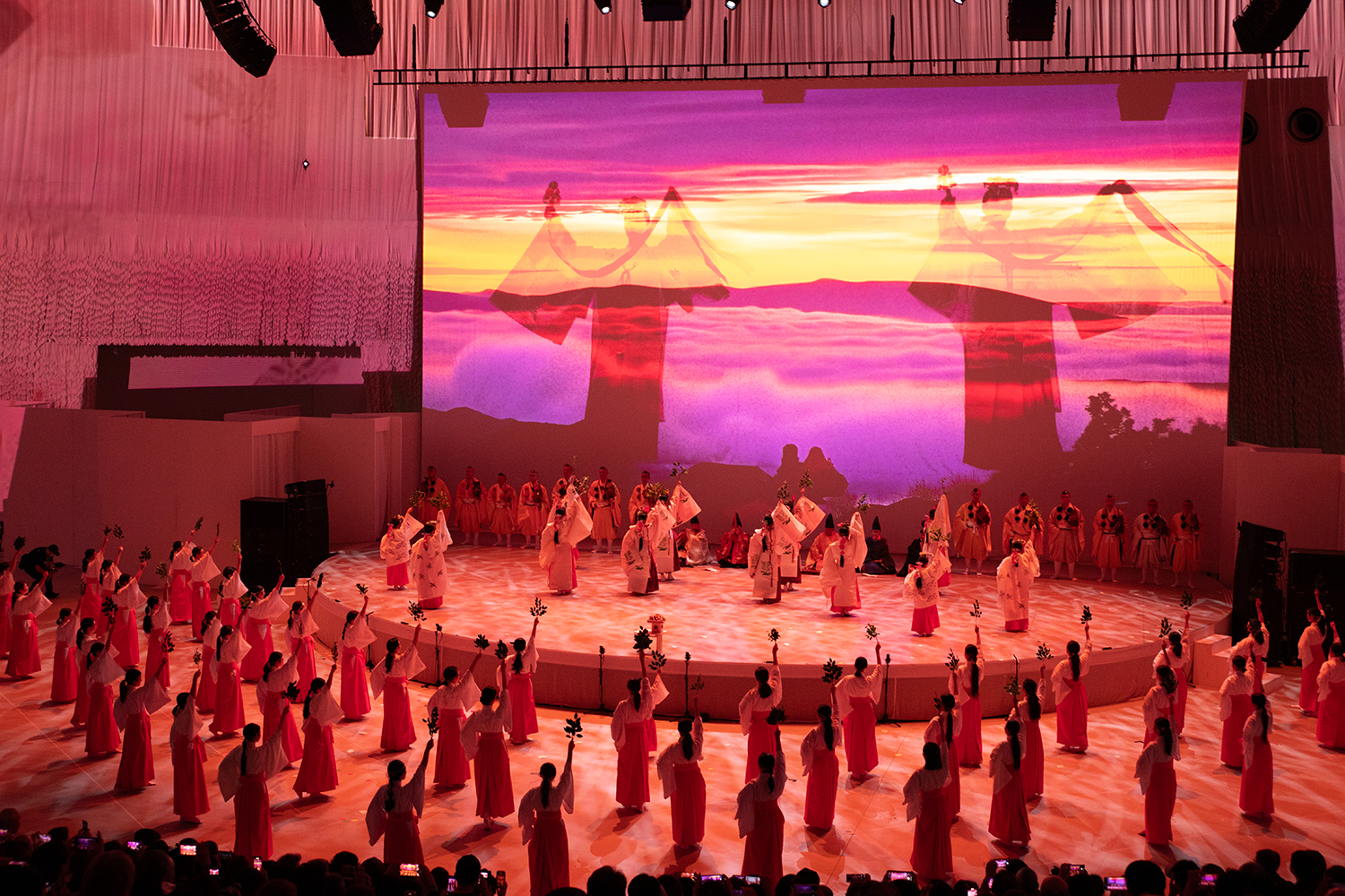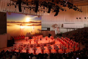 物語が終盤に差し掛かり、静寂に包まれた会場に70名の巫女が歩みを進めると、空気は一変しました。揃いの装束に身を包んだ彼女たちが舞う姿は、個人の自己表現を超えた、日本人が古来より脈々と受け継いできた「感謝」と「祈り」の結晶でした。人間国宝の方々による伝統芸能の深みと、協会が育んできた若き巫女たちの祈りの舞が融合した瞬間、舞台は単なるショーではなく、神聖な「儀礼」へと昇華しました。世界各国から訪れた観客は、彼女たちの指先の動き一つ、静かな足運びに宿る「和みの心」を目の当たりにし、日本の精神性を肌で感じる証人となりました。